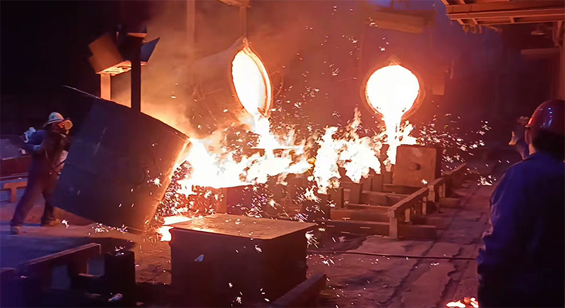 1月20日下午7點,星火機床公司鑄造現場,指揮人員一聲令下,三臺天車吊著盛滿鐵水的三個澆包,在短短3分20秒內,將35噸鐵水同時澆入CNC850/6m床身砂型型腔,成功完成了澆注任務,標志著星火鑄造具有了澆注大噸位鑄件的能力。