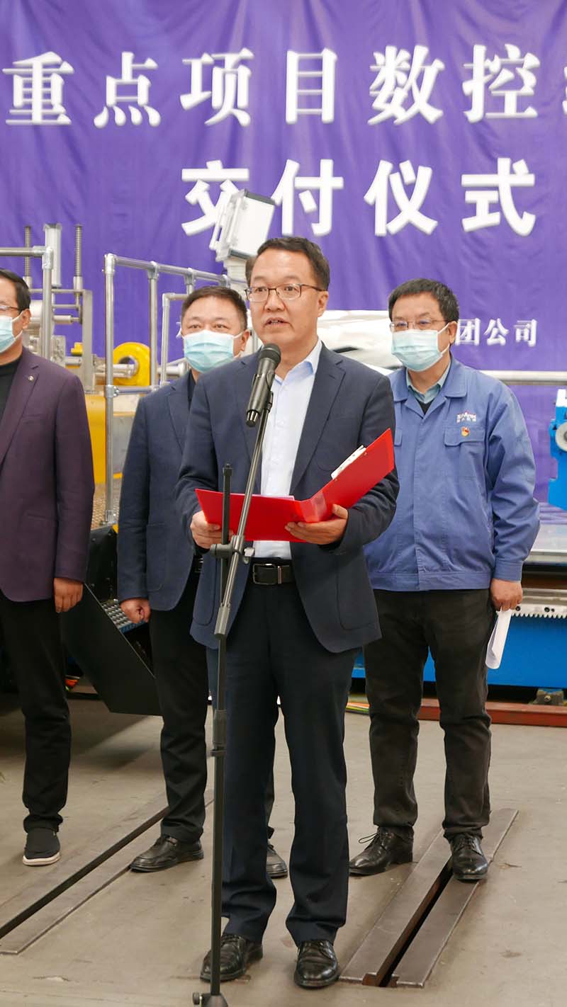 星火機床集團公司黨委書記、董事長蔣保權致辭并介紹項目研發情況,對各位領導、用戶代表在目前疫情防控關鍵時期蒞臨星火機床生產現場,參加公司國家重點項目數控纏繞設備交付儀式表示熱烈歡迎!
