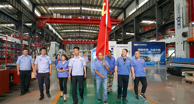 在黨旗的引領下,大家秩序井然的參觀了星火機床公司展廳和生產現場。星火機床公司黨群工作部部長蔡建欣向緱占彪一行詳細講解了企業的建廠歷史、產品研發、企業文化、公司“十四五”規劃及生產流程等內容。