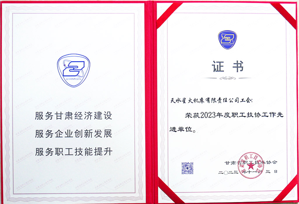 近日,甘肅省職工技術協會表彰全省職工技協先進,星火機床公司工會榮獲“2023年度職工技協工作先進單位”,工會副主席蔡建欣榮獲“2023年度職工技協工作先進個人”稱號。